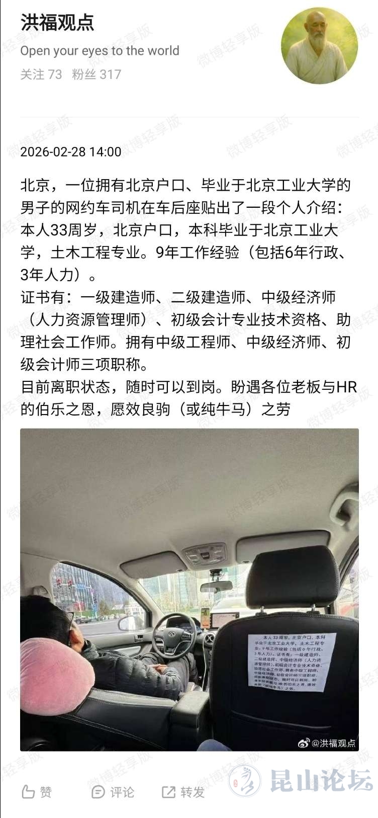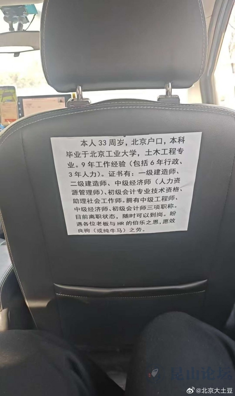 北京,一位拥有北京户口、毕业于北京工业大学的男子的网约车司机在车后座贴出了一段个人介绍:本人33周岁,北京户口,本科毕业于北京工业大学,土木工程专业。9年工作经验(包括6年行政、3年人力)。